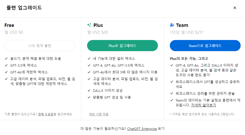 모종의 이유로 챗gpt 팀 플랜을 팔고 있지만 정작 저는 챗gpt 무료버전을 사용하고 있습니다.