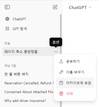 오늘 보니 챗GPT 지난 목록 우클릭에 '아카이브에 보관'이 있더라고요? 그래서 보관해보았죠.
