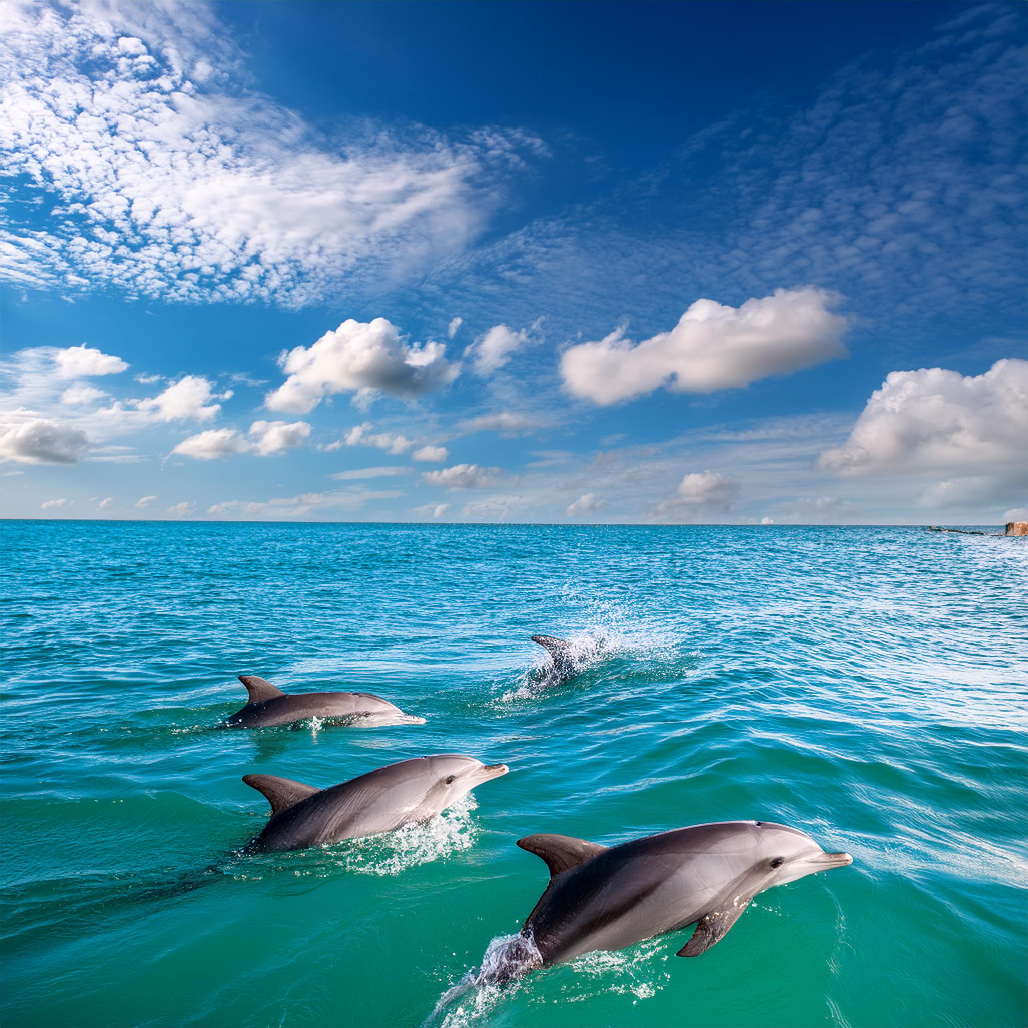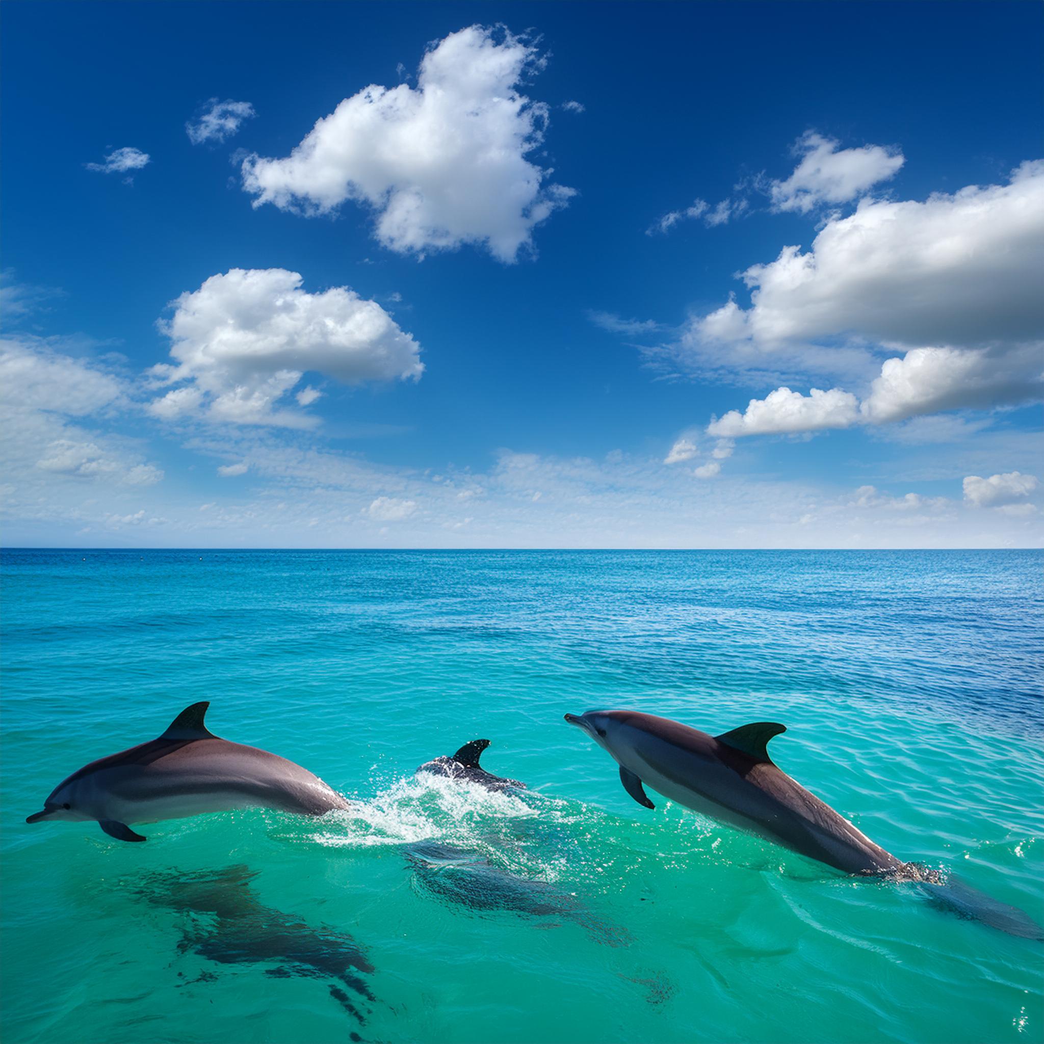 "무더운 여름날, 파란 하늘, 에메랄드빛 바다에 돌고래. 하늘엔 하얀색 구름."