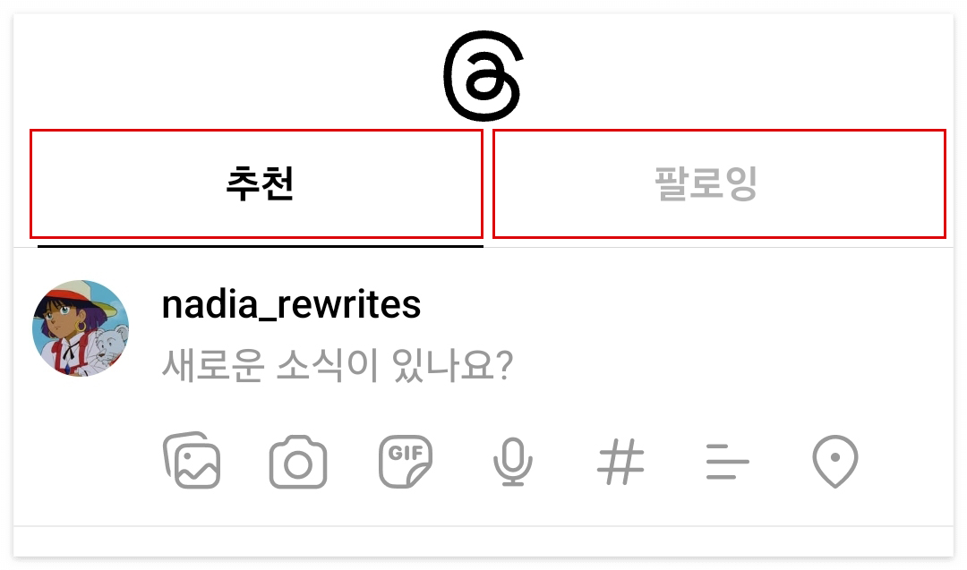일반적으로 스레드에는 ‘추천’과 ‘팔로잉’ 두 개의 기본 피드가 있음.