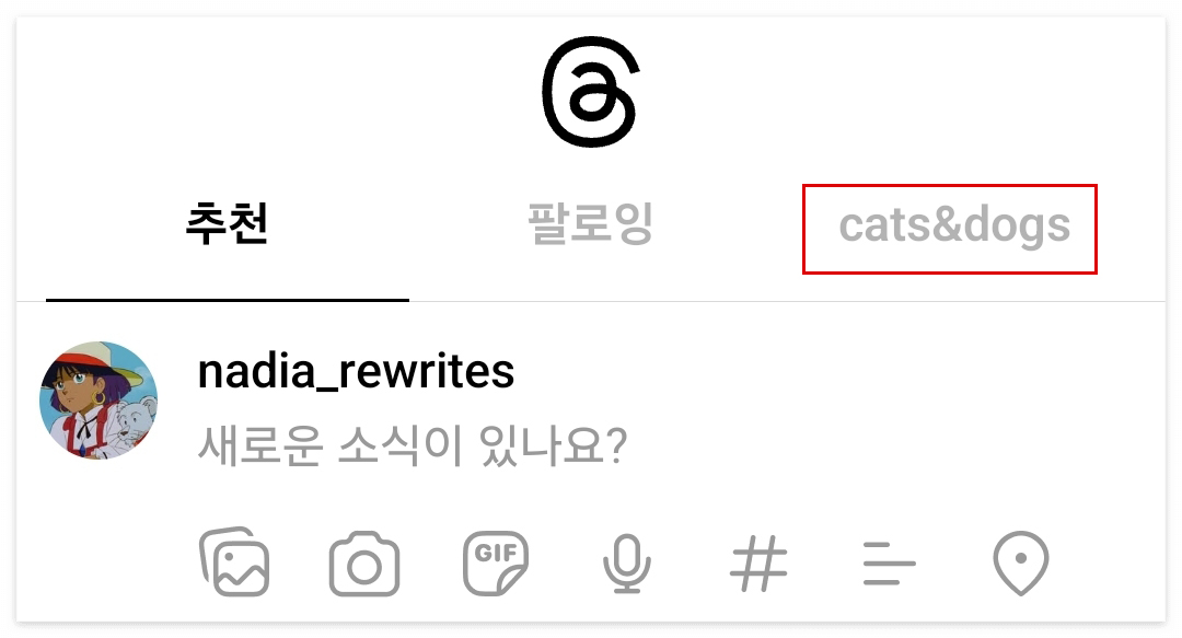 >> 주제를 넣을 수도 있고 특정인의 프로필을 추가해 스레드 상단 탭에서 그 사람의 글만 모아 볼 수도 있다는 말.