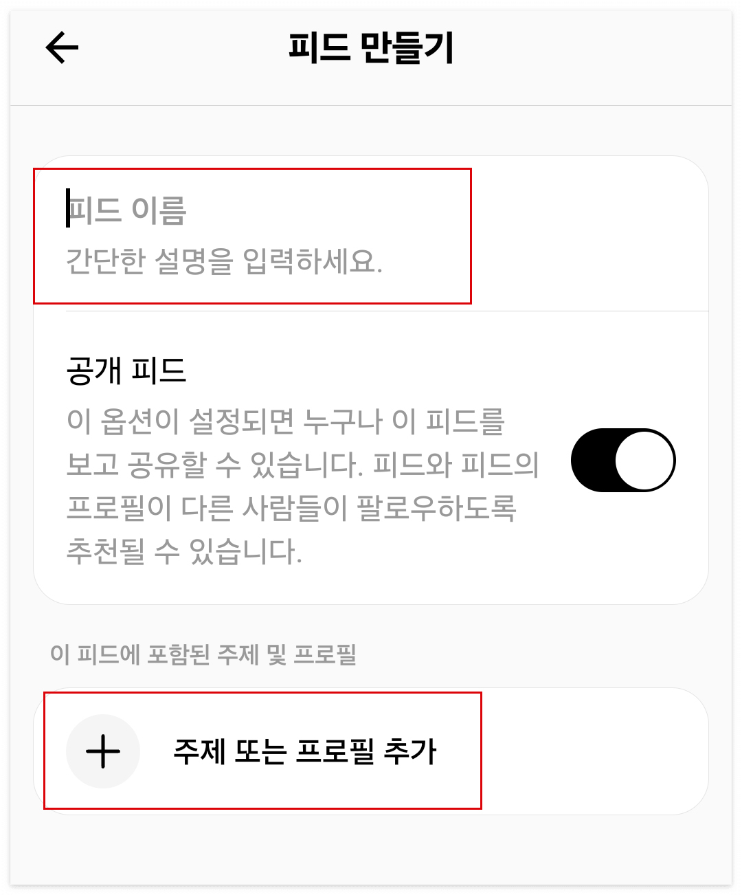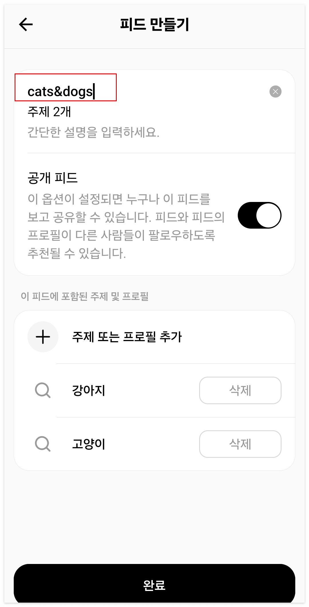 피드 이름 만들고 공개할건지 말건지 결정하고 주제나 프로필을 추가하면 됨.
